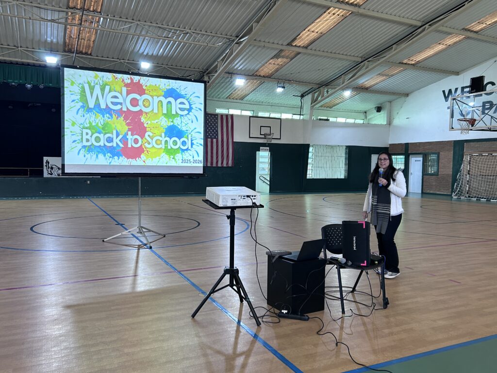 Mrs. Swisher at the welcoming assembly to explain some important details high school students need to know. [By Dr. Meier]